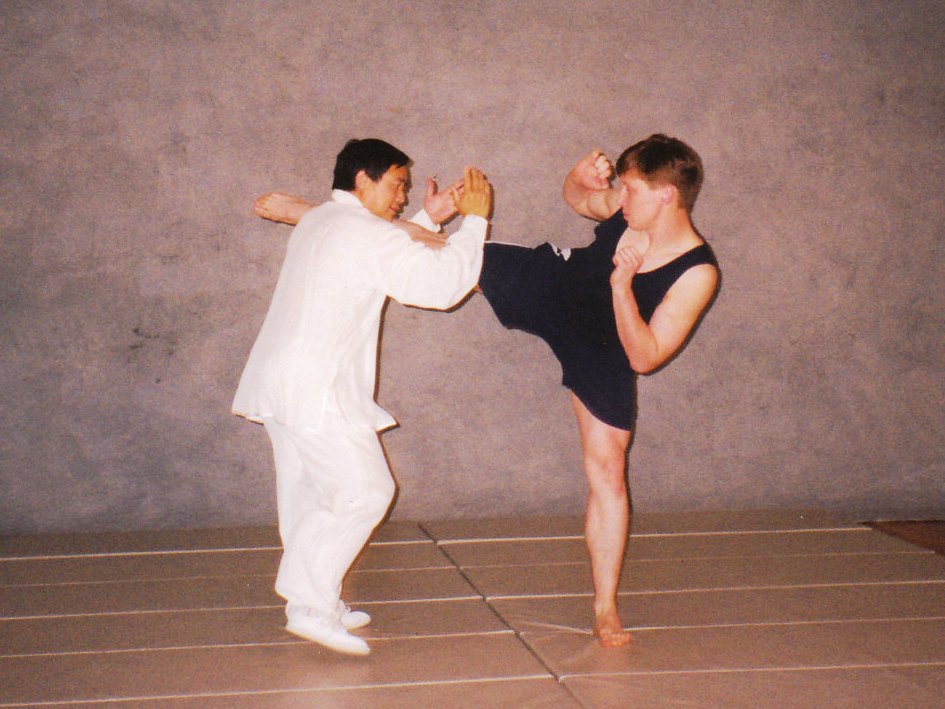 San Shou (散手 Sparring) focuses on martial arts applications. Its training contents are drawn from many schools and traditions of Chinese martial arts. At our school the program is divided into: solo practice, matching routines (對練 Duilian), Chinese wrestling (摔跤 Shuaijiao), Western wrestling and ground fighting, joint lock & control (擒拿 Qinna), push hands (推手 Tuishou), special develop speed and reaction training, strength and endurance training, body conditioning, iron shirt (鐵布衫 Tie Bu Shan) and internal energy work (氣功 Qigong), which finally all together leads to free sparring (散手 Sanshou).